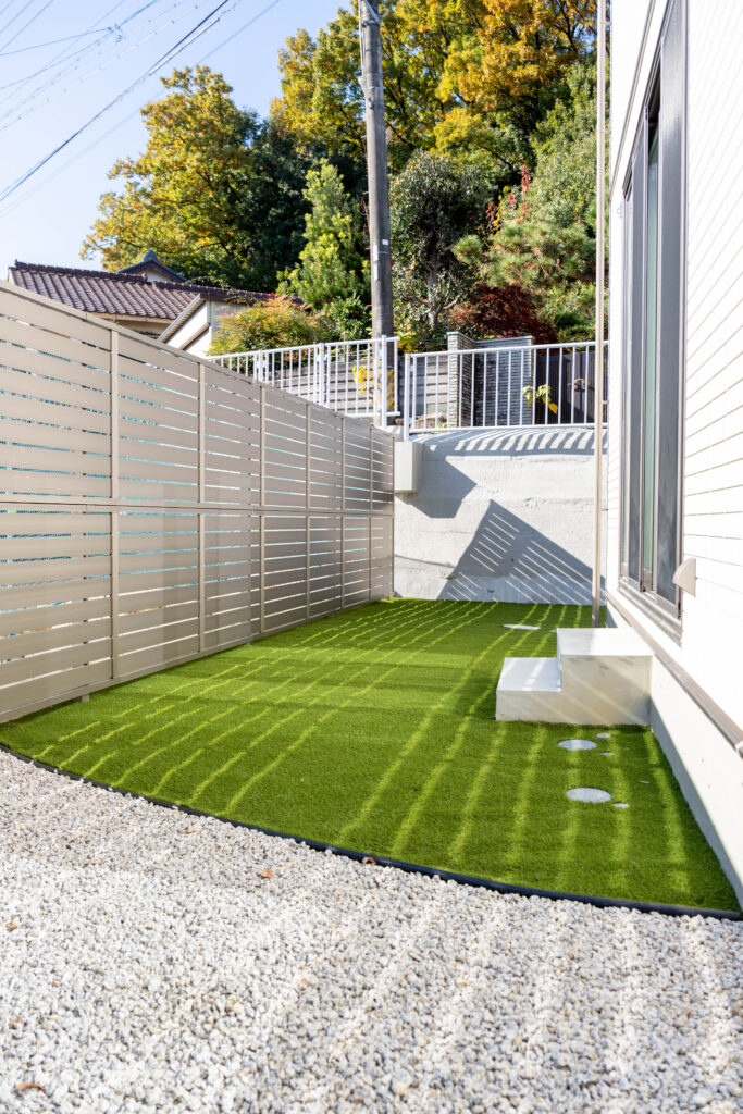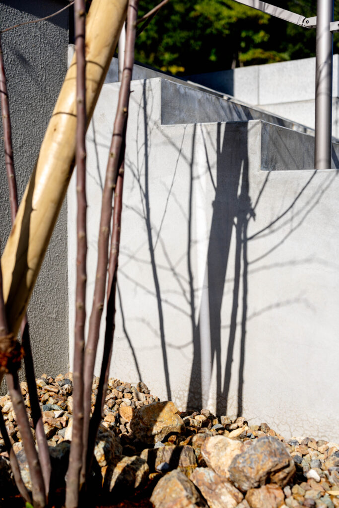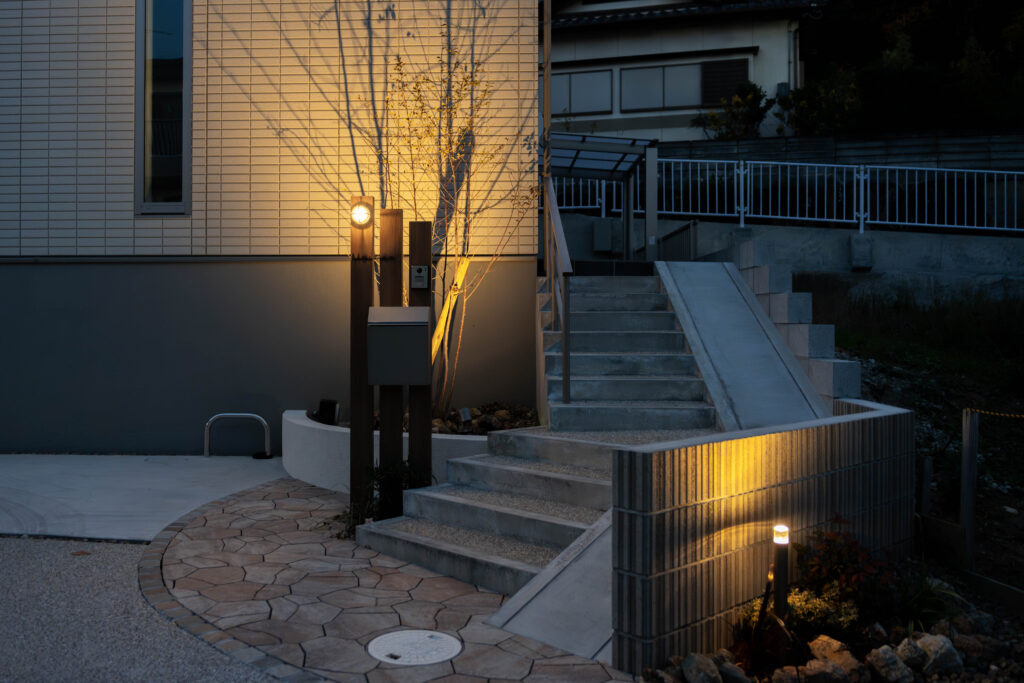 夜は壁面に移る植栽の影とマリンライトの柔らかい光が心地よく出迎えてくれる優しい外構になりました。