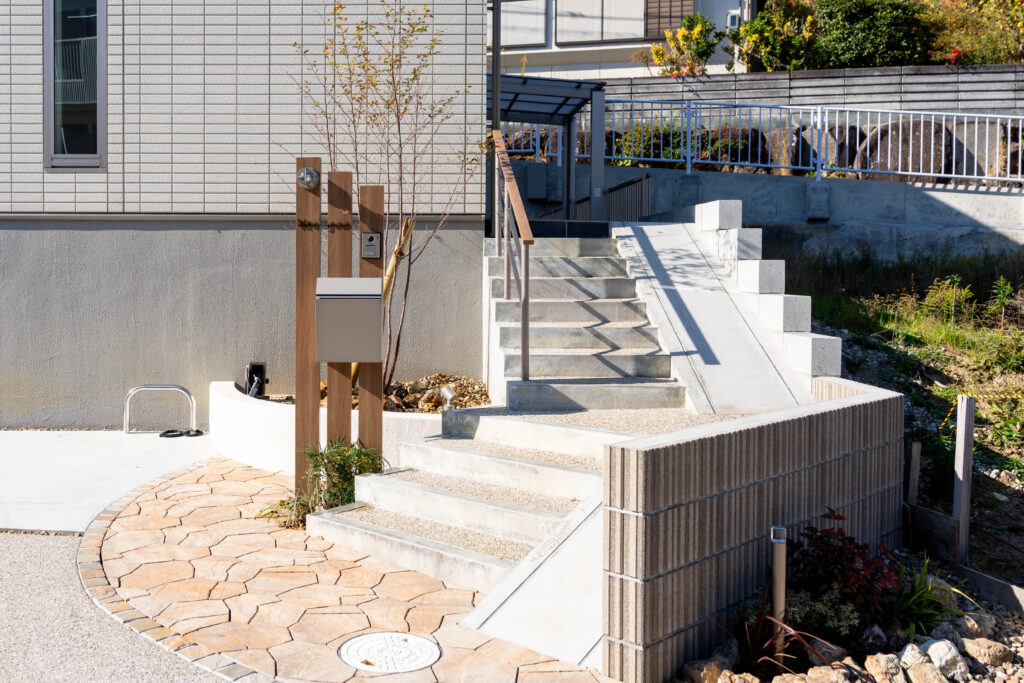 名東区|穏やかな曲線を描くアプローチと角柱門柱が出迎えてくれる優しい外構