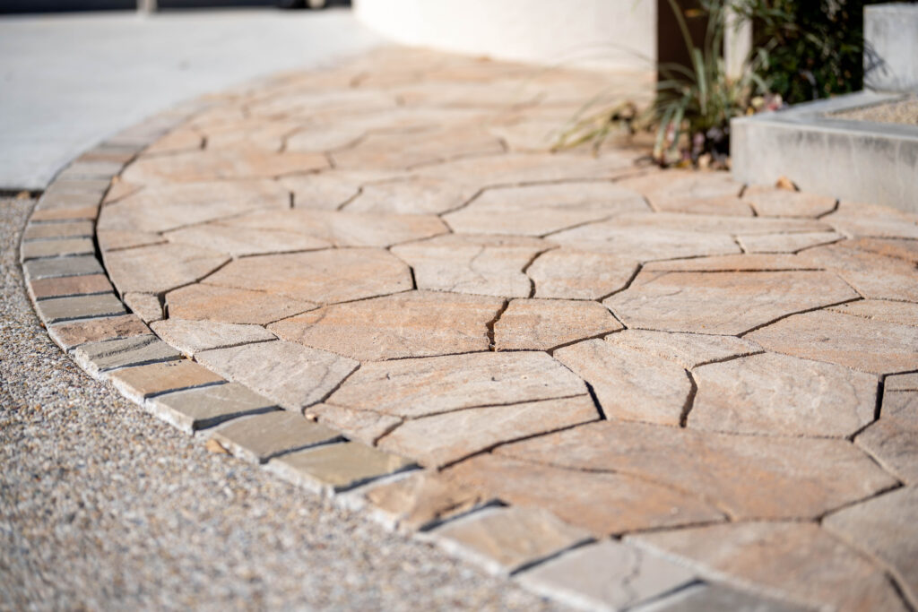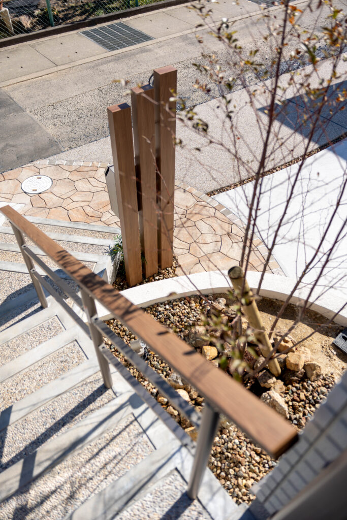 柔らかな曲線のアプローチとリズム良く建てられた角柱門柱の外構