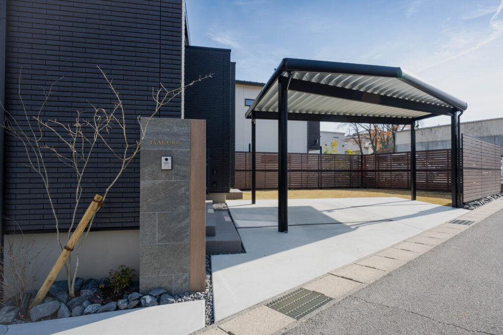 建物のデザインに調和するよう、造形と配色をシンプルにまとめた外構です。