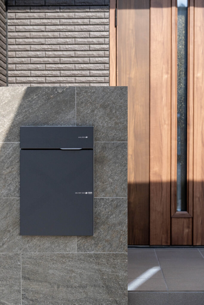 玄関ドアからすぐにアクセスできるポスト・宅配ボックス。実用的な機能の門柱は暖色寄りのグレータイルを基調に木目アクセントを取り入れることで建築デザインに馴染みます。